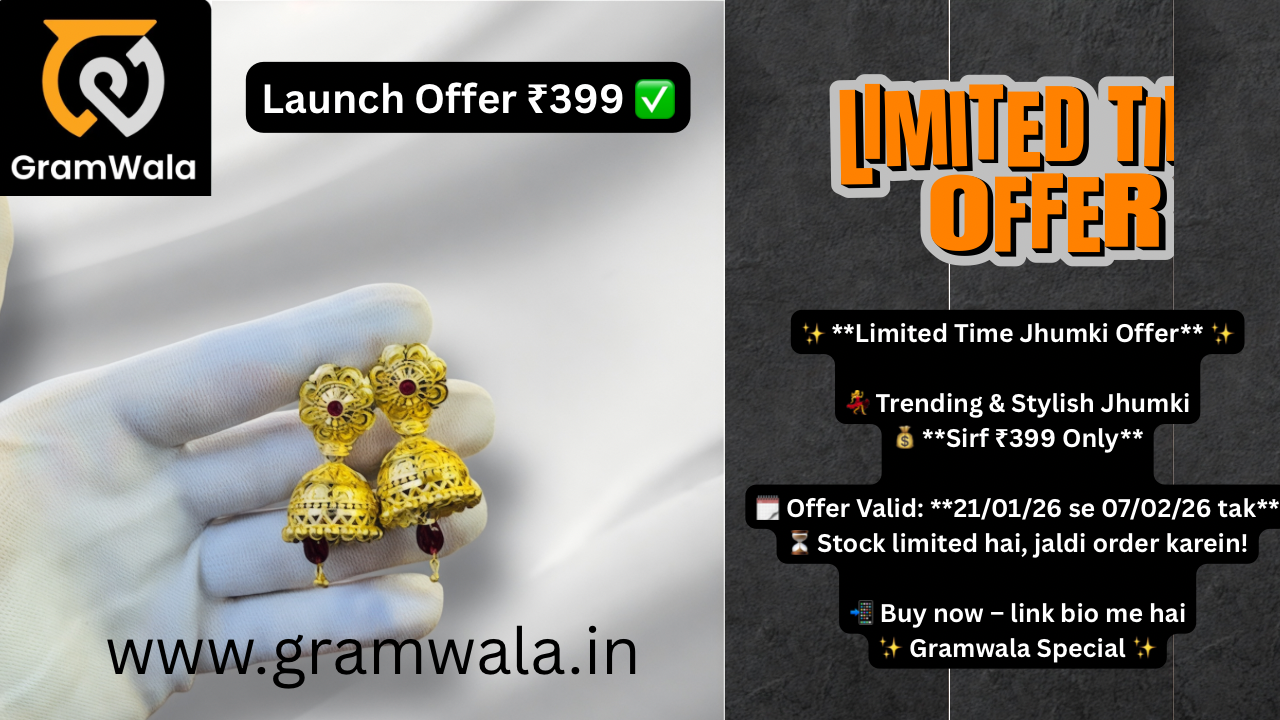 Premium Gold Plated Finish ✔️ Stylish & Lightweight Jhumki ✔️ Daily Wear + Party Look ✔️ Skin Friendly & Comfortable ✔️ Trusted Gramwala Brand